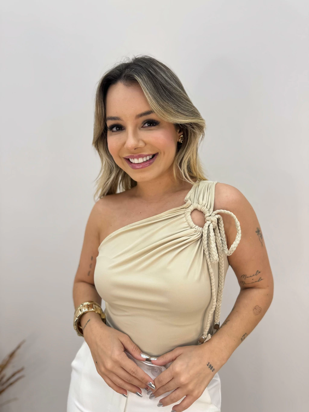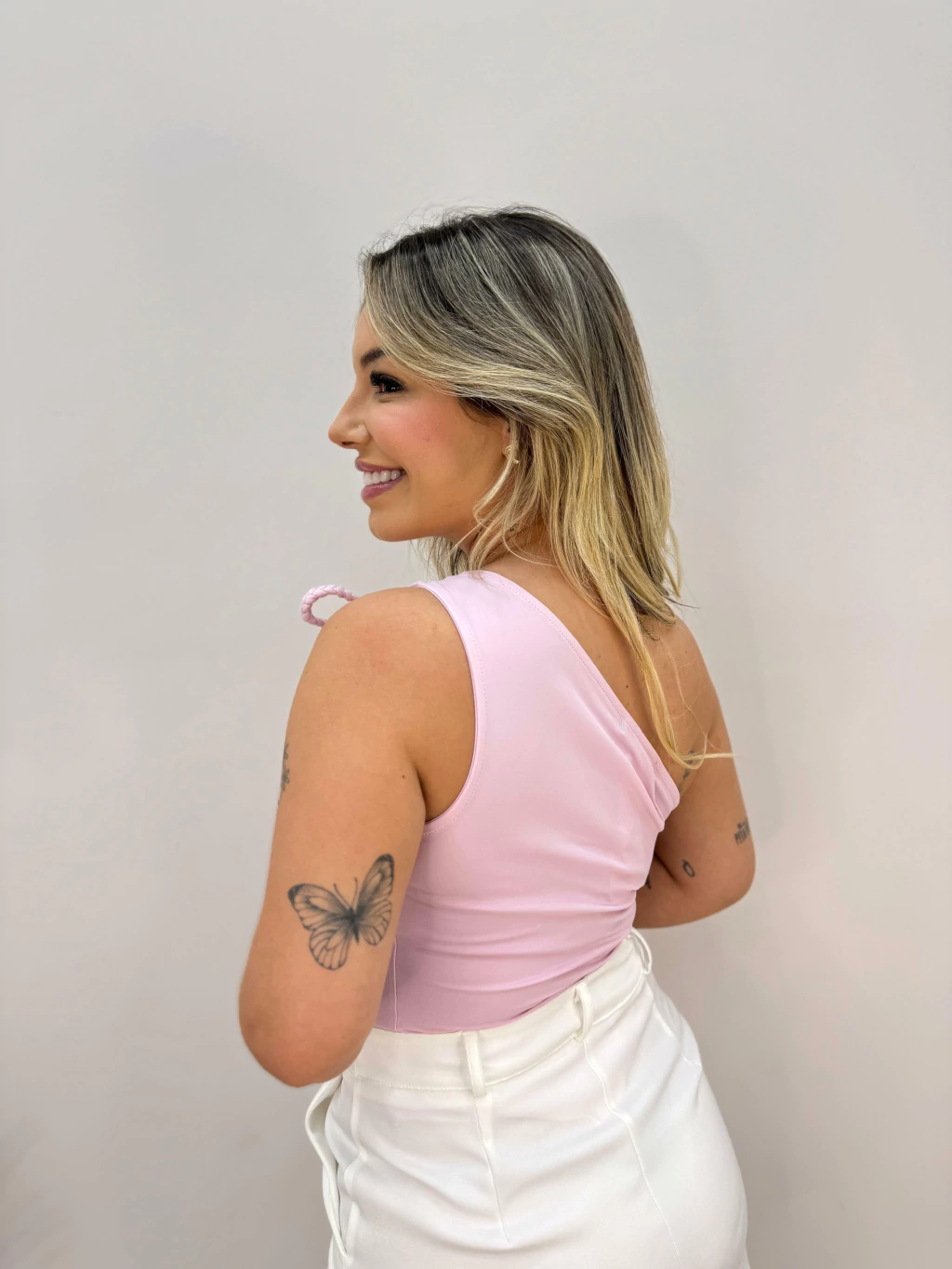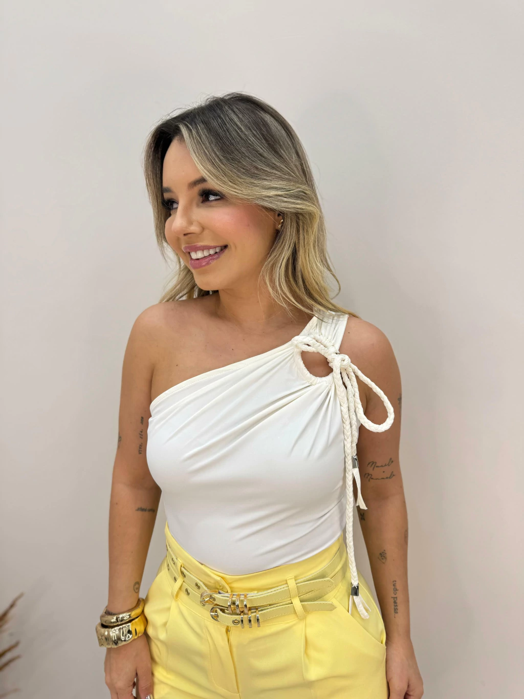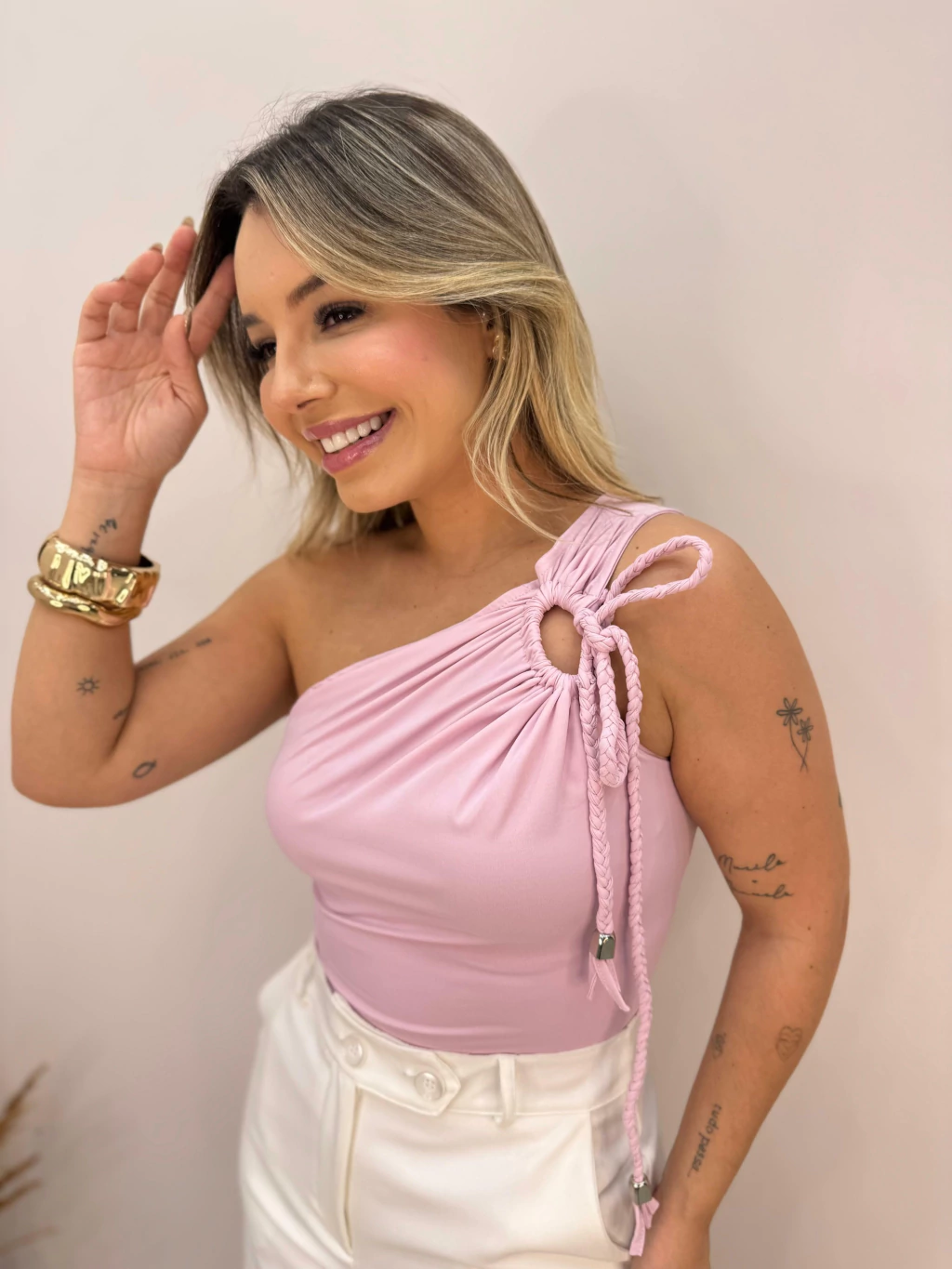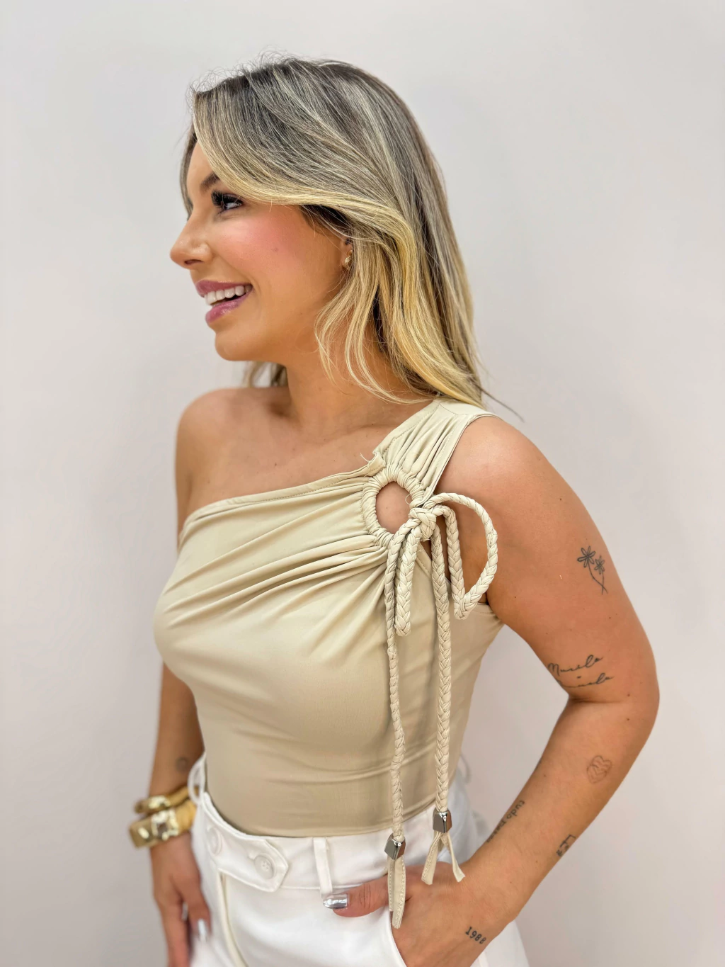 Modelo de um ombro só, com detalhe em cordão trançado e amarração no ombro, trazendo um toque moderno e delicado. Confeccionado em tecido macio com caimento perfeito, garante conforto e estilo em qualquer ocasião. Perfeito para compor looks versáteis, do casual ao elegante.