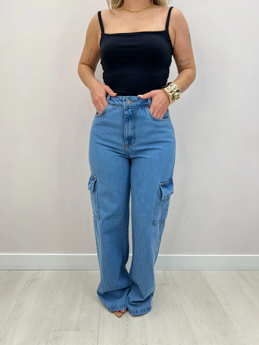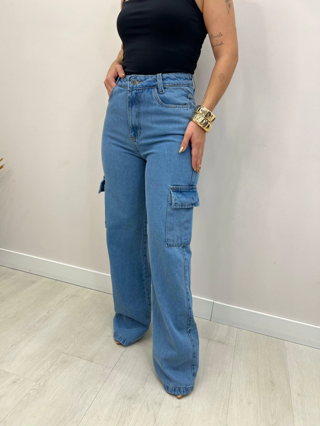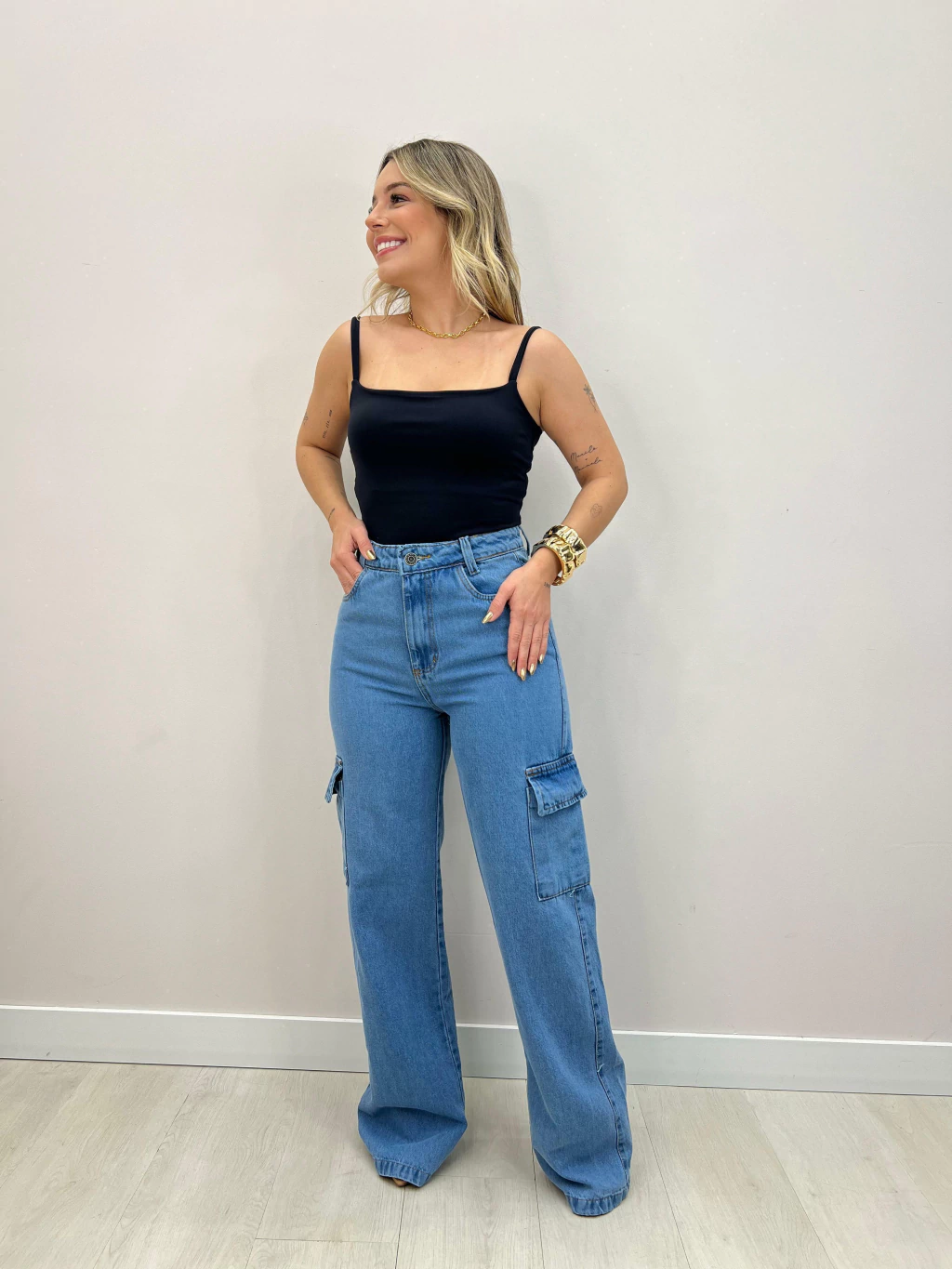 A calça jeans cargo é a escolha perfeita para unir praticidade e estilo. Com modelagem reta e caimento moderno, ela conta com bolsos laterais funcionais que garantem um visual despojado e atual, ideal para produções casuais ou urbanas.
