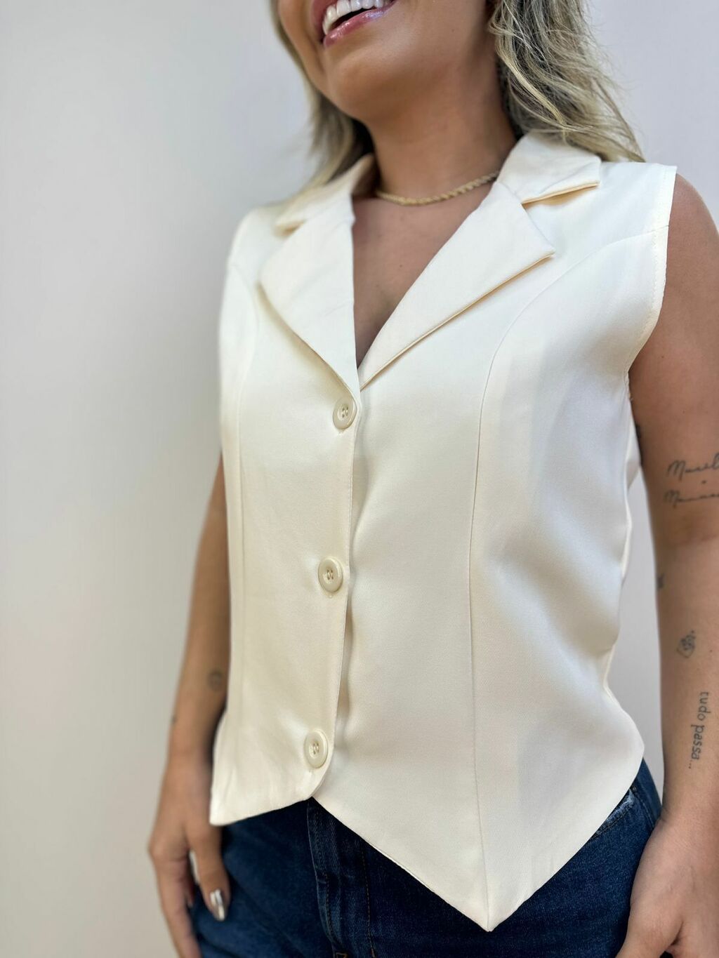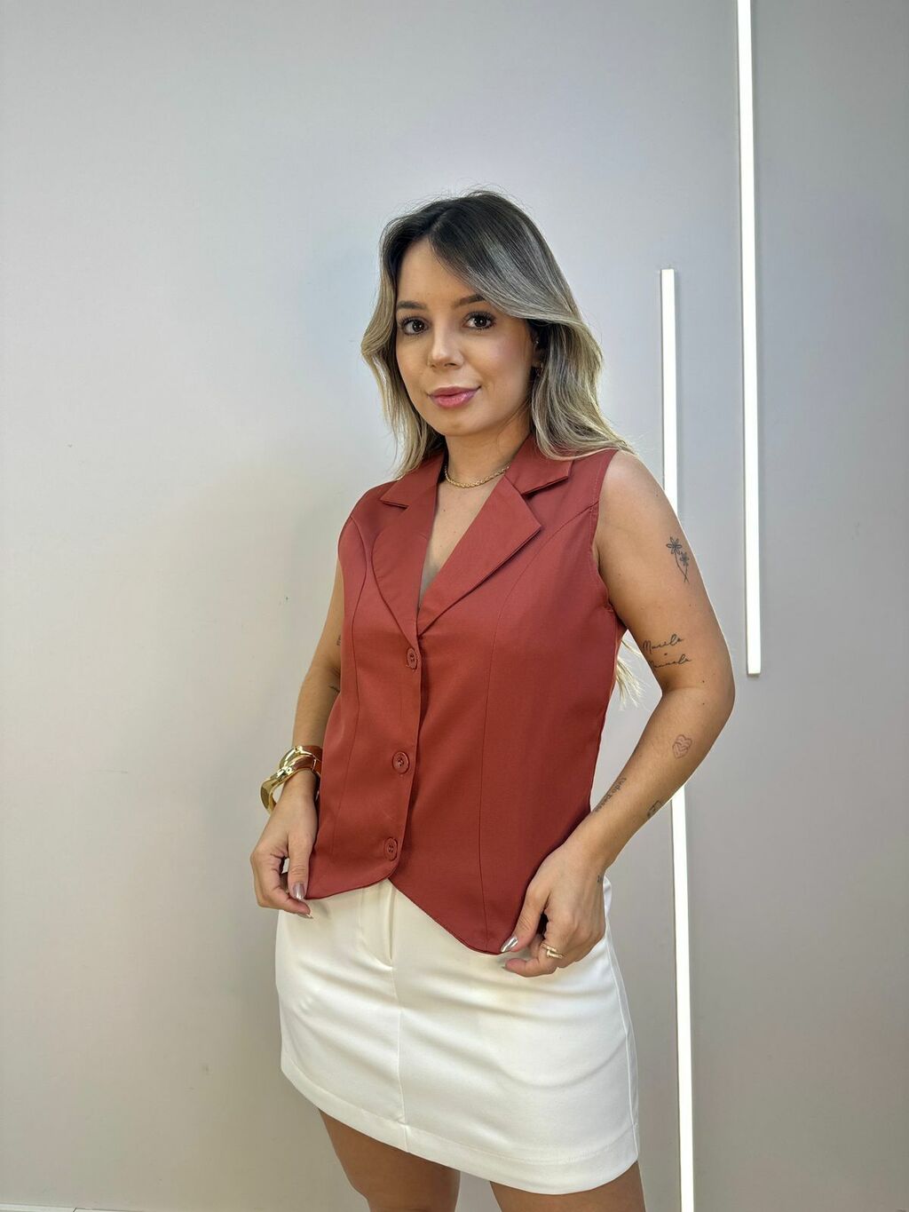 Elegância em forma de colete! Essa peça é a união perfeita entre o clássico e o moderno. Com modelagem alfaiataria e acabamento impecável, ele valoriza a silhueta com sofisticação. Ideal para compor produções mais refinadas, mas também funciona super bem com jeans para um visual fashion e equilibrado.