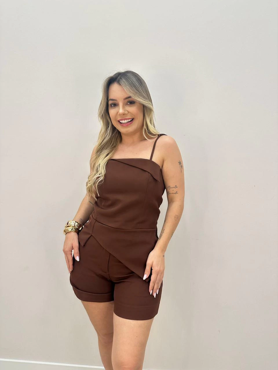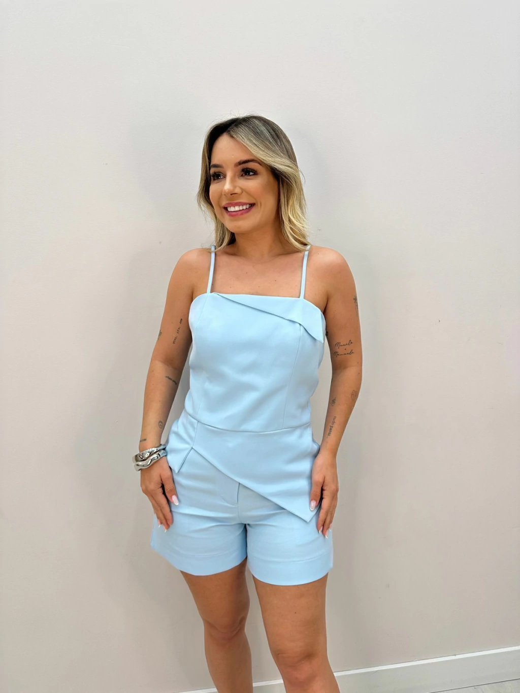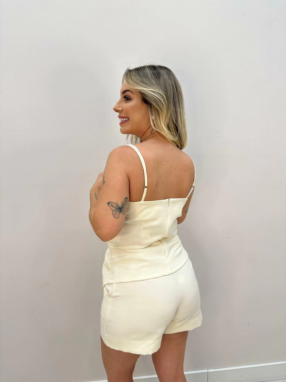 Com design elegante e contemporâneo, este conjunto traz a sofisticação da alfaiataria com um toque moderno e feminino. A blusa de alças finas possui decote reto com detalhe dobrado, conferindo charme e delicadeza. O short de cintura alta vem com recorte frontal assimétrico, valorizando a silhueta com conforto. Ideal para quem busca praticidade e estilo em uma única proposta.