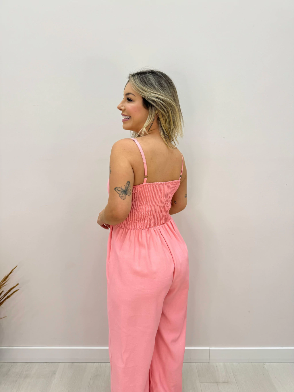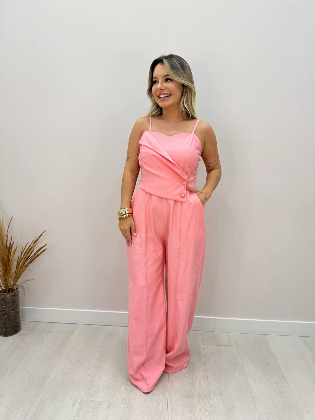 Peça sofisticada e atemporal, o macacão com alças finas traz leveza e elegância ao visual. O decote transpassado valoriza o colo de forma delicada, enquanto a modelagem pantalona garante caimento impecável e muito conforto.