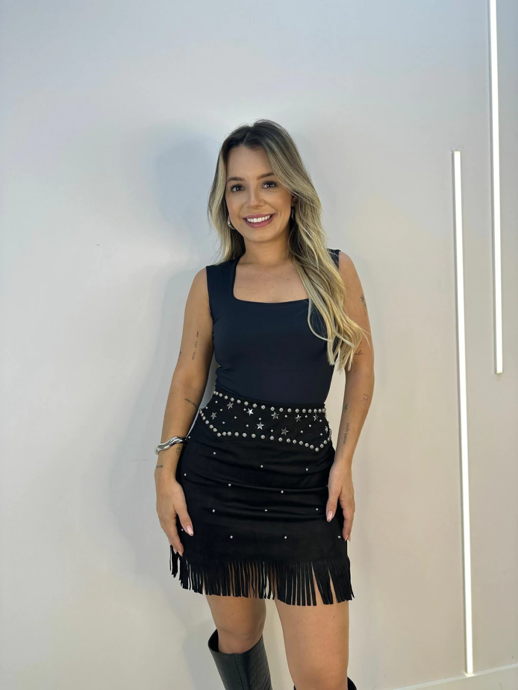 Saia Suede com Franjas e Aplicações – 88% Poliéster, 12% Elastano