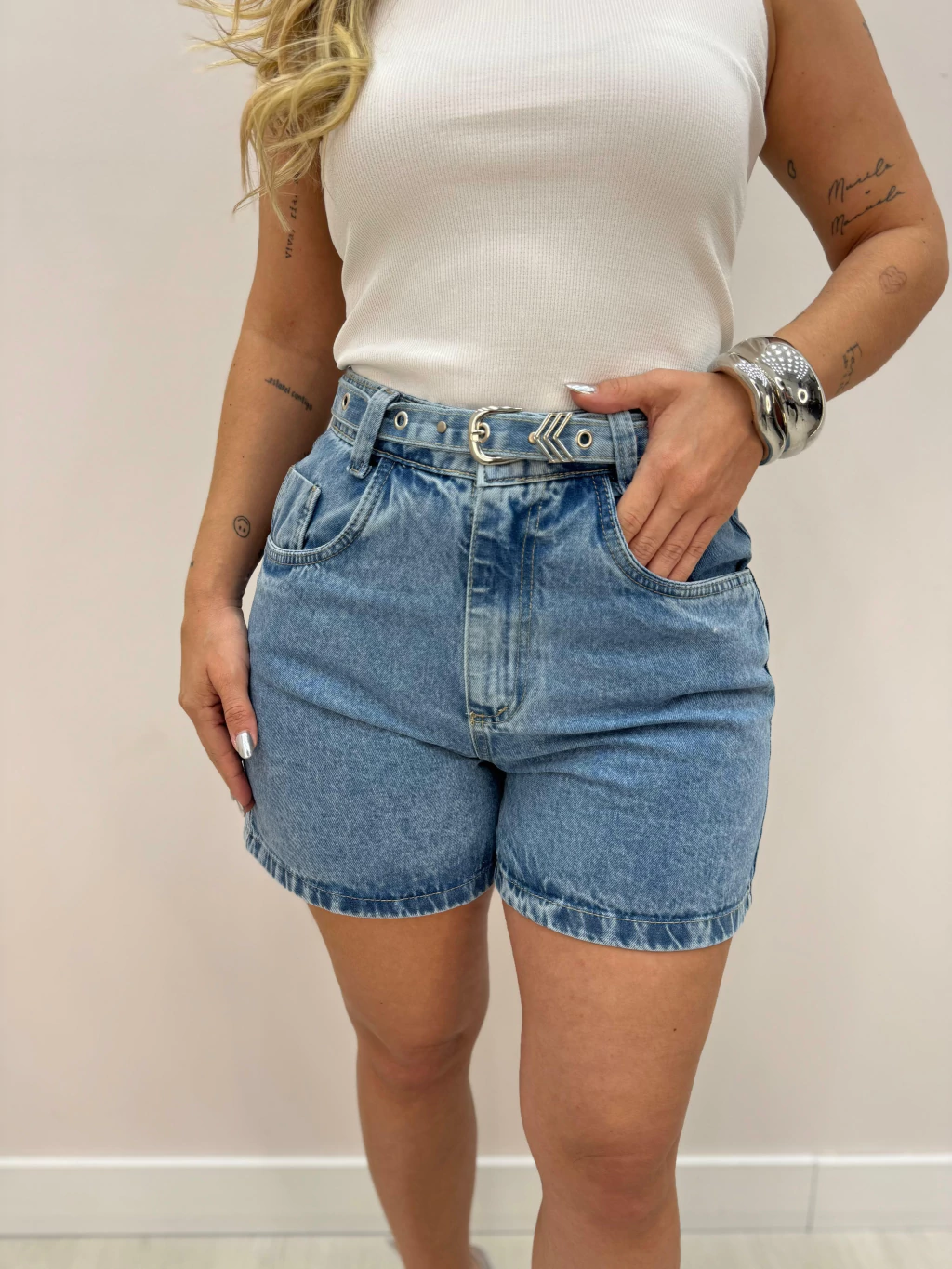 Clássico e atemporal, esse shorts jeans é perfeito para compor looks estilosos e confortáveis. Confeccionada em jeans 100% algodão, ela oferece um caimento estruturado e toque macio. O modelo de cintura alta valoriza a silhueta, e o cinto da um charme especial.